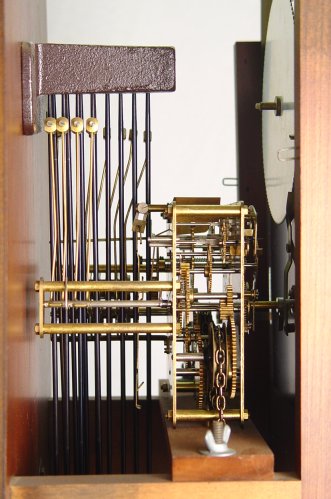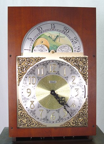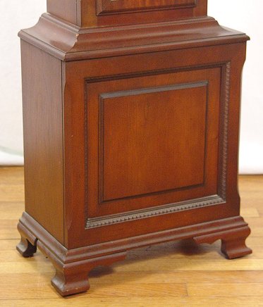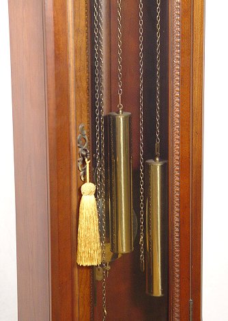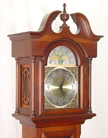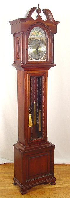 COLONIAL WEIGHT DRIVEN GRANDMOTHERS CLOCK: Clock is a triple chime clock playing Westminster, Whittington or Winchester. Walnut case. Moon phase dial, 3 weights, seems to be in good working order. 77''h, x 16'' x9''
