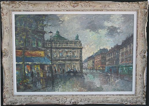 DOZEMAN, Roelof, (Dutch, 1924-): Parisian street scene, O/C, 24'' x 36'', signed lower right, encased in original carved and white washed antiqued frame, 31 1/2'' x 43 1/4''.