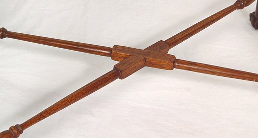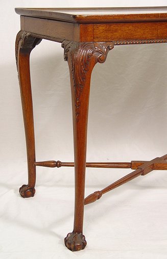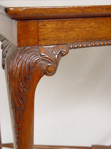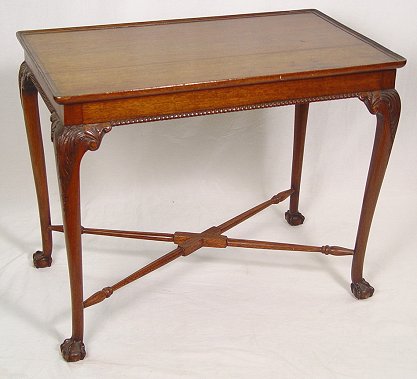 CARVED MAHOGANY SIDE TABLE: Carved cabriole legs ending in ball and claw feet, gadroon edging along the apron, cross stretcher. 24''h. x 29 1/2'' x 17 1/2''.
