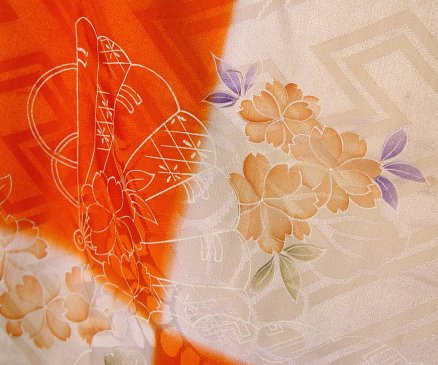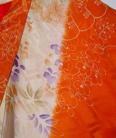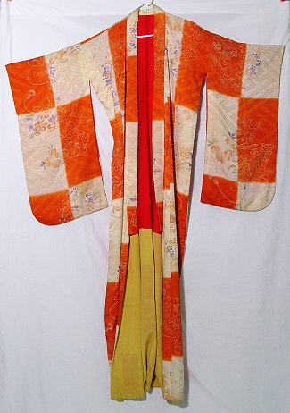 VINTAGE 1940'S JAPANESE LADIES KIMONO: Full length silk traditional Japanese patterns of fans and flowers in alternating blocks of orange and ivory, fully lined in red and yellow, long drop sleeves.