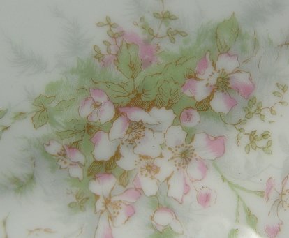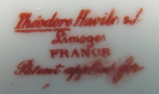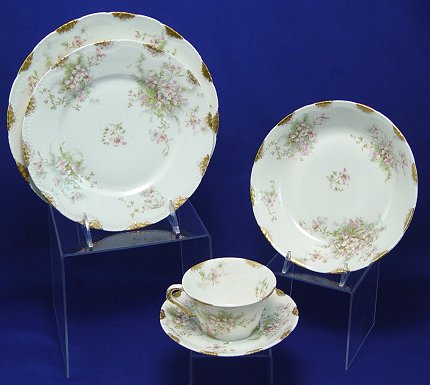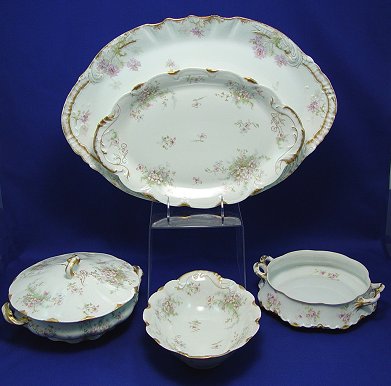 THEODORE HAVILAND FINE CHINA CA. 1904-1920'S: 41 pieces to include 11 dinner plates, 9 soup bowls, 11 cups and saucers, 6 dessert bowls, oval vegetable bowl, covered vegetable, gravy with underplate, and a 14'' platter. Sold with a Limoges 18 1/2'' platter and pierced handle plate in a coordinating pattern.