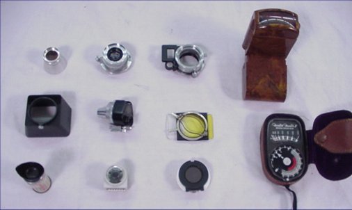 1938 LEICA III CAMERA AND ACCESSORIES: Leica No 299821. Sold with Utilo Lens Shade in the box, Ernst Leitz lens and a Leita finder in boxes, numerous pamphlets, Leitz Nooky lens in box, Ramstein filter in box, Omag filter in leather case, Leitz sun shade in box, Intoscope in box, an Arcadia commander viewer in box, and a Weston Master II universal exposure meter in leather case.