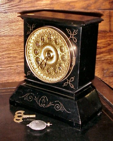 ANSONIA VICTORIAN SHELF CLOCK: Incised gold gilt carved decoration on black faux slate finish, ornate brass dial, bell strike movement, replacement key and pendulum.