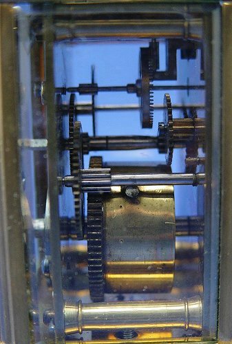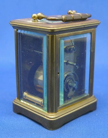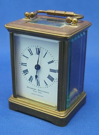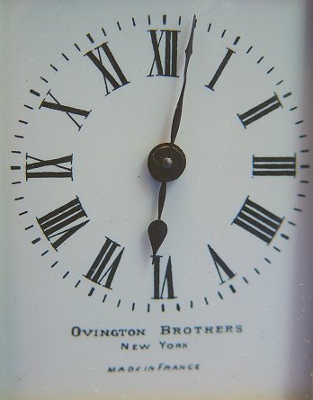MINIATURE FRENCH CARRIAGE CLOCK: Retailed by Ovington Brothers, New York. Works and dial marked ''Made in France''. Brass and beveled glass, the enamel dial is in excellent condition. No key. 3 1/2''h. x 2 1/2''.