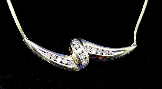 FREEFORM DIAMOND NECKLACE: Approx. 1ctw of diamonds, 15 round cut stones of approx. 7pts each set in 14k yellow gold with attached chain, 18''l., 9.2 grams.