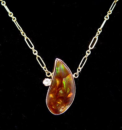 DEER CREEK FIRE AGATE AND DIAMOND NECKLACE: Tear drop polished agate set in 14k accented with a small diamond, attached long link chain, 16 1/2''l.