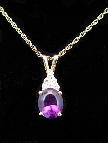 LOVELY AMETHYST AND DIAMOND PENDANT: Oval amethyst, 10 x 8.2 x 5.8mm, set in gold galleried prong mount, signed O-O, accented by 6 small diamonds, on a 16''l. Italian 14k gold chain, 4 grams.