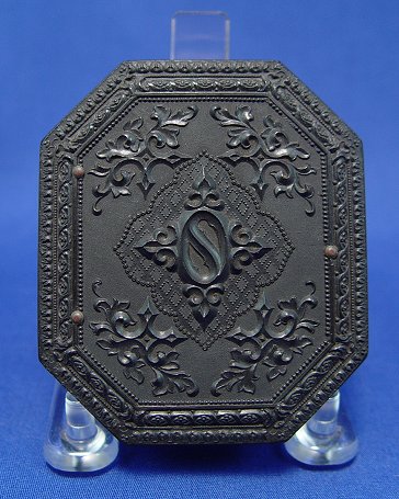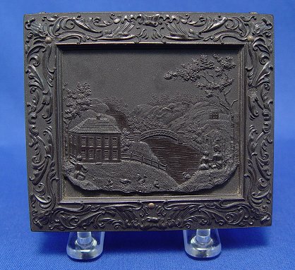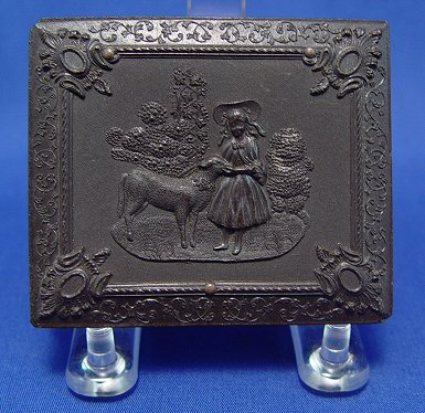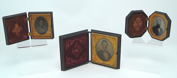 GROUP OF THREE GUTTA PERCHA CASES: The largest is a detailed scenic landscape with house on a river with figures and chickens, 3 7/8'' x 3 3/8'', with photo of a young man. Octagonal case is a geometric design, 3'' x 2 1/2'', photo of bearded man. The third case has design of little girl with lamb, 3'' x 2 1/2'', photo of young woman (no glass). Each case is in very good condition.
