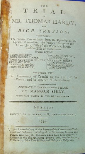 1794 ''TRIAL OF THOMAS HARDY FOR HIGH TREASON'': By Joseph Gurney, Printed by P.Byrne, Dublin, copyright 1794