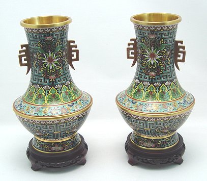 BEAUTIFUL BLACK GROUND CLOISONNE VASES: Polychrome floral design, applied step handles, 8 1/2''h. plus wooden stands.