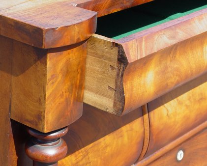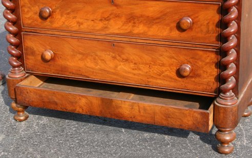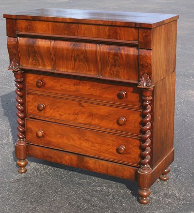 19TH CENTURY MAHOGANY SCOTTISH CHEST: Highly figured crotch grain mahogany chest with spiral quarter columns. Unique 1 drawer over 3 drawer over 3 drawer case. Note 3 drawer bank is Bombe' shaped with molded edge. 55''h x 51''w x 22''d. Est. $1200/1500**