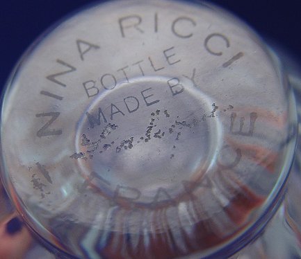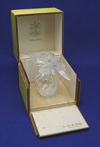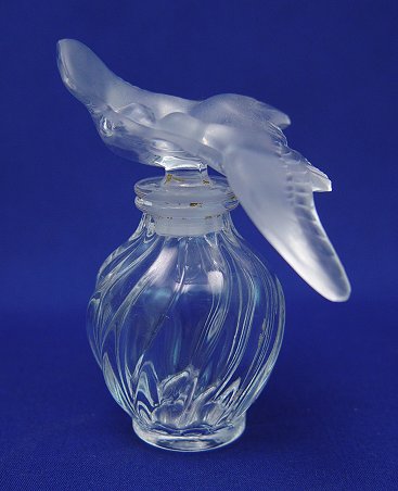 LALIQUE FRENCH CRYSTAL PERFUME BOTTLE FOR NINA RICCI: Love birds finial, in the original presentation box. 3 1/2''h. Free of chips.