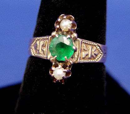 18K GOLD VICTORIAN RING: Set with a green stone with abraded edges and two seed pearls, 18k (assayed) band with etched shoulders, monogrammed interior ''Katie''. Size 6.75, 3 grams.