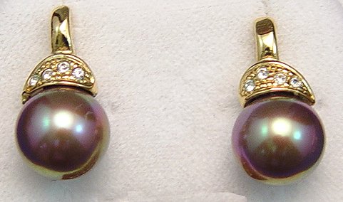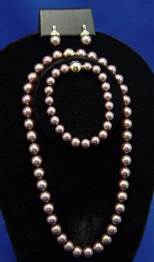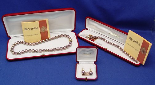 MAJORICA PEARL ENSEMBLE: Lovely luminous purple sheen, set to include, 18'' necklace, 10.4mm pearls, with gold bead screw clasp, 7 1/2''l. bracelet 8.5mm pearls, with gold bead screw clasp & a pair of pierced earrings. All in original boxes.