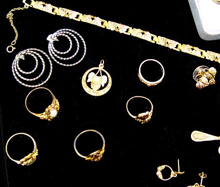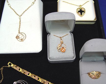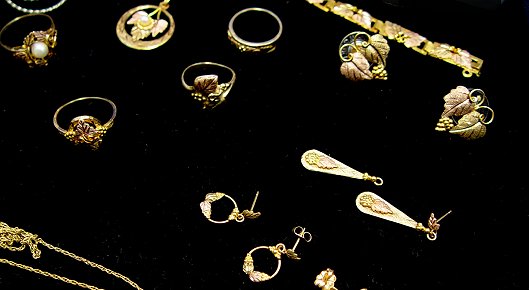 LOT OF BLACK HILLS JEWELRY: Large selection of necklaces, earrings, rings and one bracelet. Mostly the traditional tri-colored gold but also includes a pair of sterling earrings. Sold as a lot.