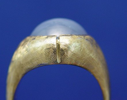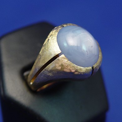 16.5 CT STAR SAPPHIRE RING: Lovely soft pale blue six point star sapphire cabochon, set in 14k yellow gold mount of brushed gold, linear highlights, size 9, 22.5 grams.