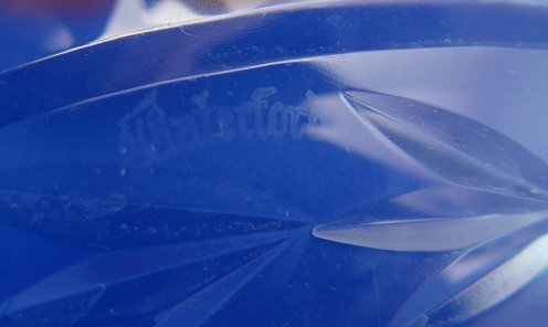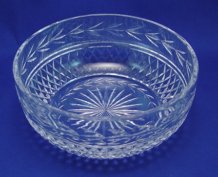 10'' WATERFORD BOWL: Lovely pattern of foliate motif wedge cuts ring the top and outer rim of base, star burst center and band of open plain diamonds, 10''dia x 4''deep, acid mark to base. No chips or cracks noted, occasional air bubble.