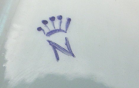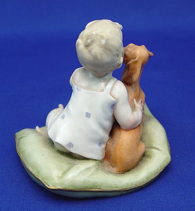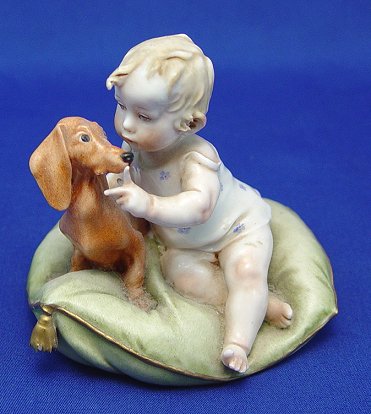 WHIMSICAL FIGURINE OF SMALL CHILD WITH DACHSHUND DOG ON PILLOW: The crown N mark is on the base, measures 3 1/2'' w, 3 5/8'' h.