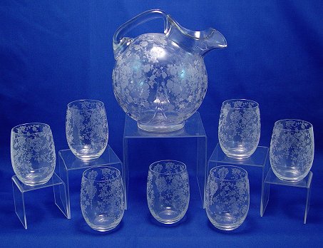 CAMBRIDGE ''ROSEPOINT'' BALL PITCHER AND 7 TUMBLERS: Elegant glass pitcher and 7 tumblers, 4 1/2''h. Free of chips or cracks.