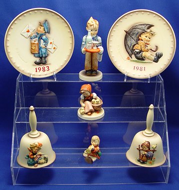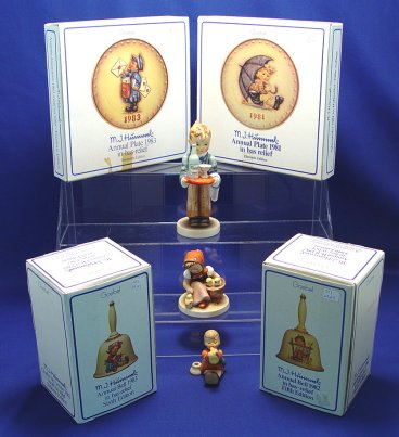 LOT OF 7 HUMMEL FIGURINES, PLATES AND BELLS INCLUDING: (1) Waiter'' 154/0, TM6, 6 3/4'', (2) ''Chick Girl'' 57/0, TM3, 3 1/2'', (3) ''Angel With Trumpet Candle Holder'', 1/38/0, TM3, 2 1/2'', (4) Annual Bell 1983 in original box, (5) Annual Bell 1982 in original box, (6) Annual Plate 1981, (7) Annual Plate 1983 Est. $300/400**