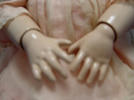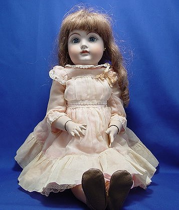 ARTIST ANTIQUE STYLE BISQUE HEAD DOLL: The head is signed ''Sady'' The body is a Seeley fully jointed composition body. The pink is older or crafted from older materials. Banana curl wig, blue glass eyes, pierced ears. 28'' tall.