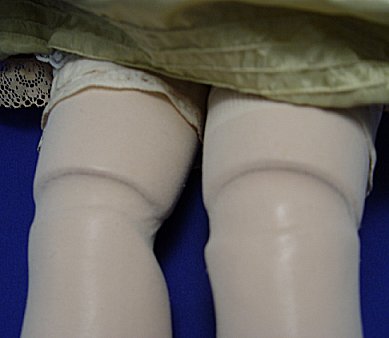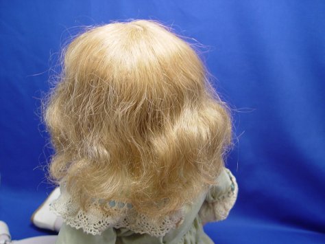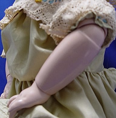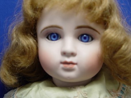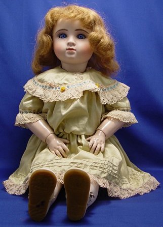 ARTIST SIGNED ANTIQUE STYLE BISQUE HEAD DOLL: The body is a fully jointed composition body. The green dress is older or hand crafted from older materials. Strawberry blonde wig. Bright blue glass eyes, pierced ears. 28'' tall.