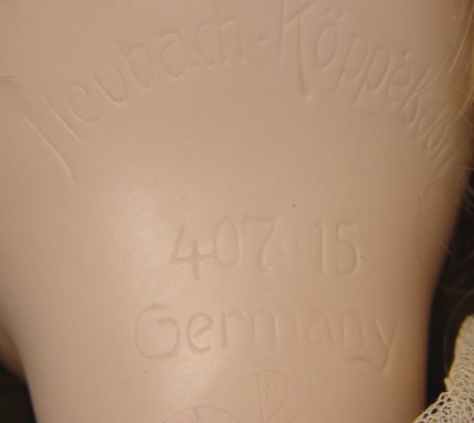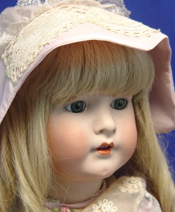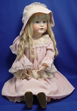 ARTIST BISQUE HEAD ANTIQUE STYLE DOLL: Molded from a Heubach Koppelsdorf. Hazel glass eyes, open mouth with teeth, long blonde banana curl wig. Beautifully dressed in handmade dress, undergarments, and shoes appropriate for the period. 30''l.