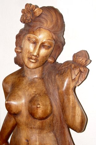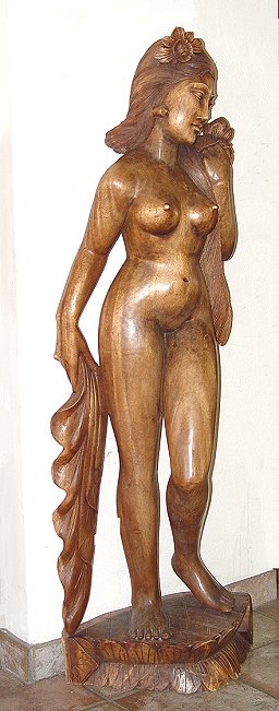 CARVED WOODEN SCULPTURE OF A NUDE FEMALE: Poise on a flower edged base, 59'' overall. Carved from a single piece of wood. Please note occasional crack.