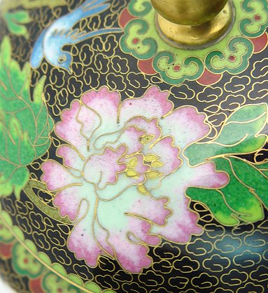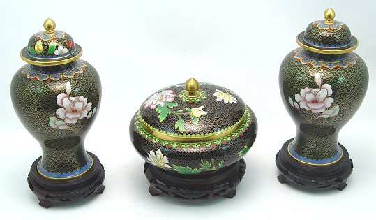 3 PC CLOISONNE LOT: To include, covered bowl on stand, black ground featuring pink, white and yellow flowers, bright green foliage and blue birds. 4 1/4''h. plus stand. And a pair of covered vases with green grounds, pink flowers, blue yellow and rust trim, 8''h. plus wooden stands. Sold as a lot.