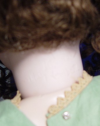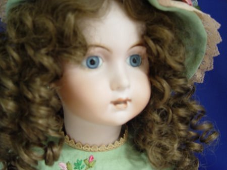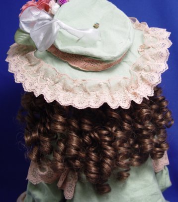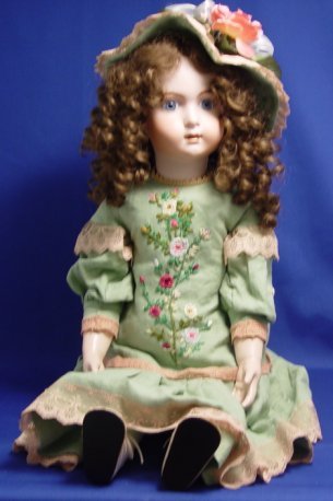 MARY LAMBETH FRENCH STYLE BISQUE HEAD DOLL: Antique style doll in incredible dress crafted from old materials. Curly curly wig, blue glass eyes, pierced ears with earrings. Jointed composition body. 31''l.