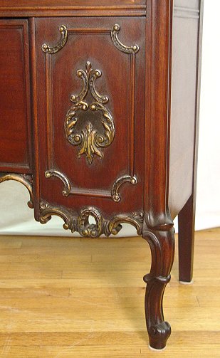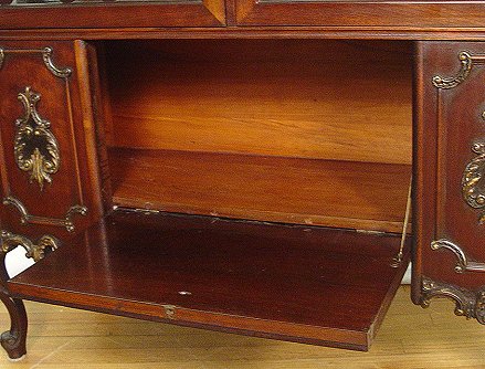 LATE 19TH C MAHOGANY CHINA DISPLAY CABINET: Glass front and sides, interior shelves have plate grooves, the bottom center has a fall front. Carved scrolled legs. 62''h. x 47'' x15''. Est. $600/800**