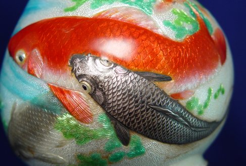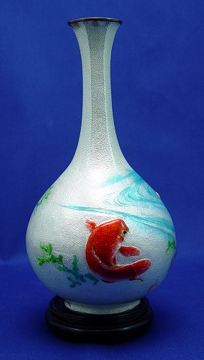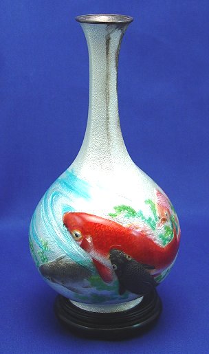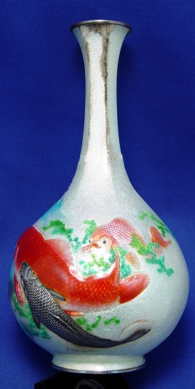 JAPANESE WIRELESS GINBARI VASE: Five koi fish in the ''blown out'' method, one of the fish being un-lacquered silver, impressed mark on the underside. Please note areas several areas of oxidation and minor spots of cracking in the lacquer finish, 8 1/4''h.