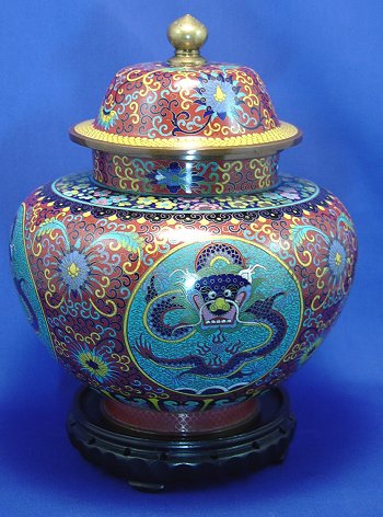 CLOISONNE COVERED GINGER JAR: Polychrome jar with dragon centered medallions, on copper?, lid closes tightly for storage. Approx. 11 1/2'' h. overall. Please note a couple of small dings. Actual age unknown.