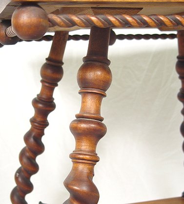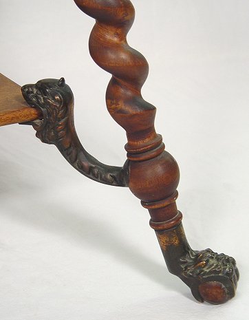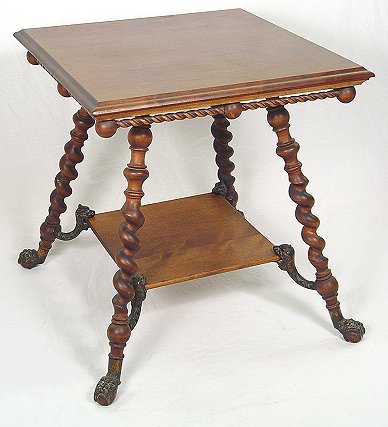SPIRAL LEG AND DRAGON MAHOGANY LAMP TABLE: Late Victorian parlor table featuring spiral legs and spiral gallery along the apron. Also figural metal dragons connect the lower tier to the legs. Metal claw with wood ball feet. 28''h. x 26'' square top.