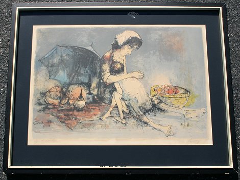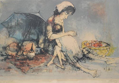 JANSEM, Jean, (French, 1920-): Mother and child with fruit and umbrella, Artist Proofed Lithograph, sight size 14 1/2'' x 21'', pencil signed lower right, marked artist proof lower left, heavy black and white contemporary frame with wear, 21 1/2'' x 26''. Condition - Faint water damage along the lower margin.