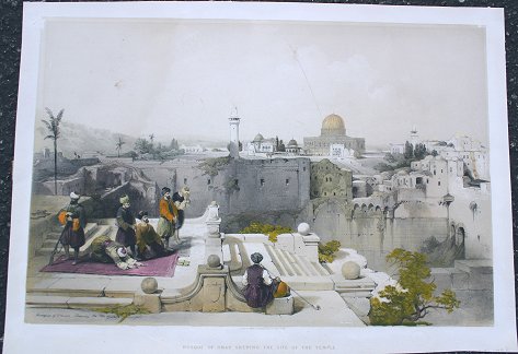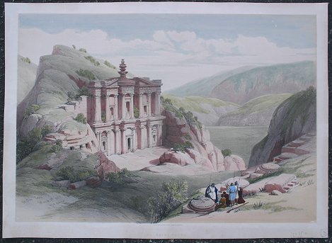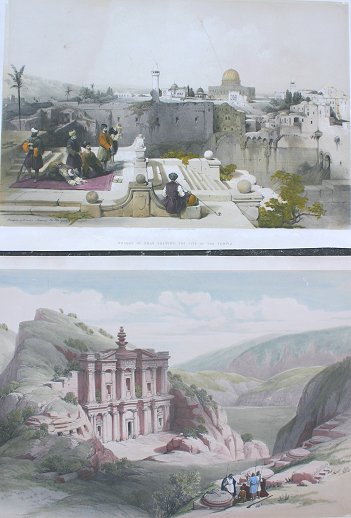 ROBERTS, David, (British, 1796-1864): Pair of colored lithographs, the first is titled ''El Deir Petra'' and the second is titled ''Mosque of Omar'', the first is 15 3/4'' x 21 3/4'' and second is 15 1/8'' x 21'', both pieces have some abrasions and mild creasing, unframed. Call for condition.