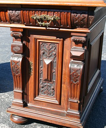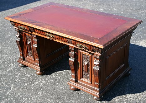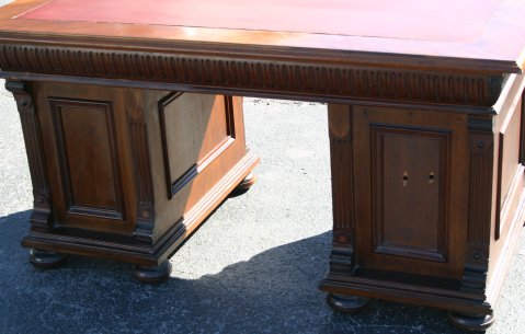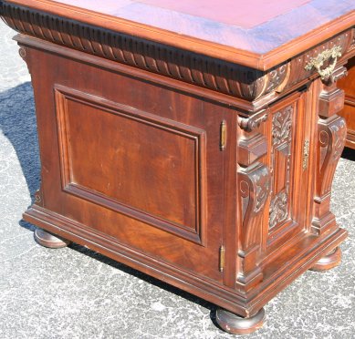 VICTORIAN CARVED WALNUT DOUBLE PEDESTAL DESK: Inset leather top over 3 drawer frieze over double pedestal base with doors that open to reveal large storage areas, overall relief carved geometric decor, original pulls, bun feet. Please note two holes are drilled in back. 30''h. x 60'' x 35''.