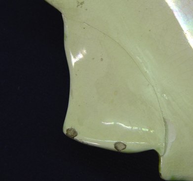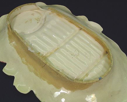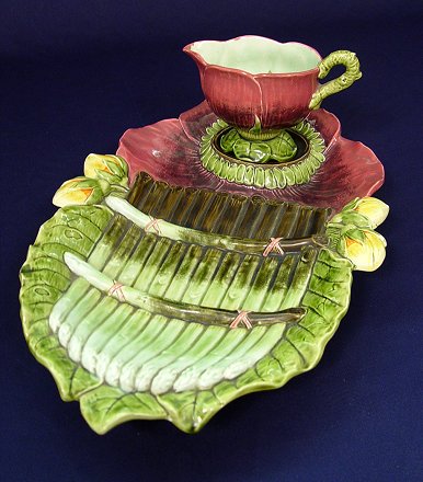 MAJOLICA ASPARAGUS PLATTER & SAUCE BOAT: Ca. 1888-1945. Julius Dressler, Austria. Gaily colored asparagus platter with matching original sauce boat. Platter bears the Dressler marks. 16''l. x 10 1/2''. Please call for condition.