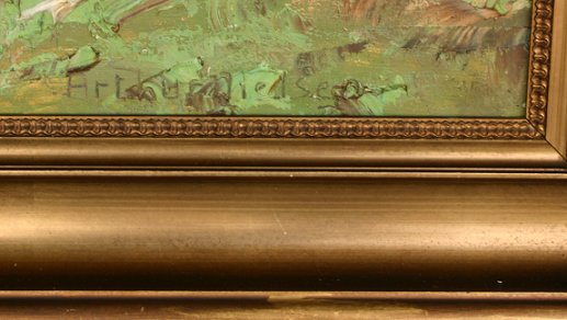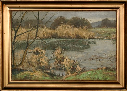 NIELSEN, Arthur, (Danish, 1883-1946): Riverside landscape, O/C, 24 3/4'' x 38'', signed lower right, signed in the stretcher verso, encased in original re-touched wide gilded frame with wear, 31 1/4'' x 44''.