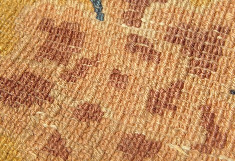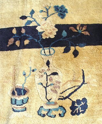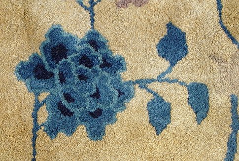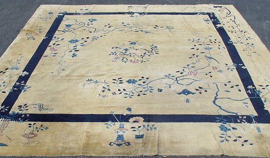 CHINESE DECO NICHOLS CARPET: Approx. 13'5'' x 12'8'', blue and golden hues, slightly worn condition.