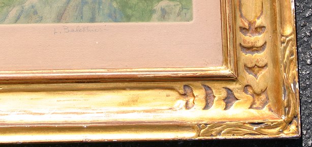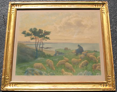 BALESTRIERI, Lionello, (Italian, 1874-1958): ''Shepherd and Flock'', Color Etching, sight size measures 21 1/2'' x 25 1/2'', pencil signed lower right , numbered 25 lower right, encased in outstanding NEWCOMB MACKLIN QUALITY carved and gilded molding, does have some wear and will need some touch-up. Condition - Browning throughout, left margin does have an area of visible water spotting.
