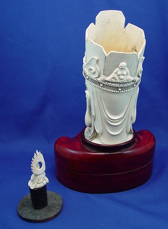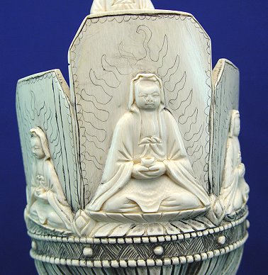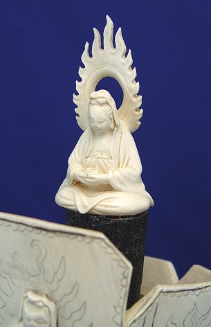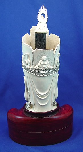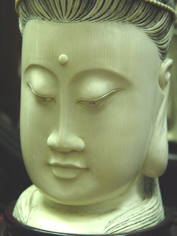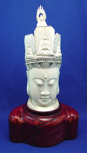 PHENOMENAL CARVED IVORY BUST OF BUDDHA: Carved from a tusk. The shoulders are carved wood. The carved meditating Buddha (3 1/2''h) at the top is mounted on wood as a cover. The ivory portion of the bust is 12''h, overall the piece is 20''h.