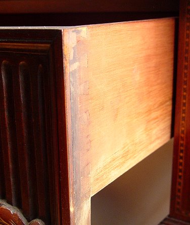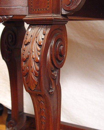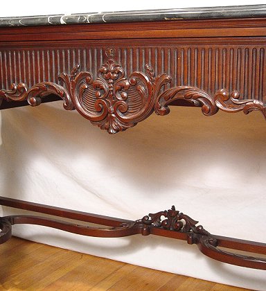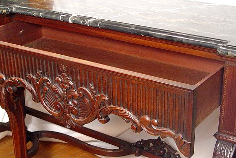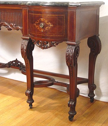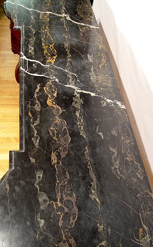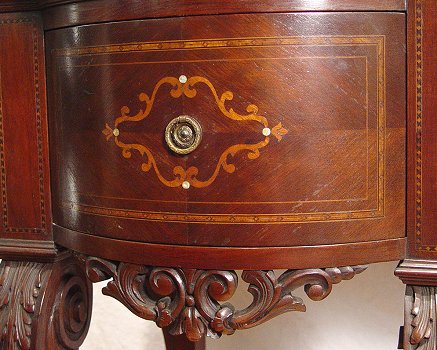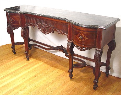 ITALIAN BLACK MARBLE TOP MARQUETRY INLAY SIDEBOARD: Beveled and shaped black marble rests on a carved and inlaid base. Bowed and marquetry side drawers flank a carved center drawer. Carved front legs. Gracious curved and carved supports. Excellent condition. 40''h. x 83'' x 24''. Est. $4000/6000**
