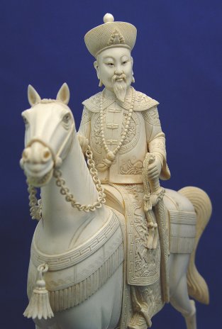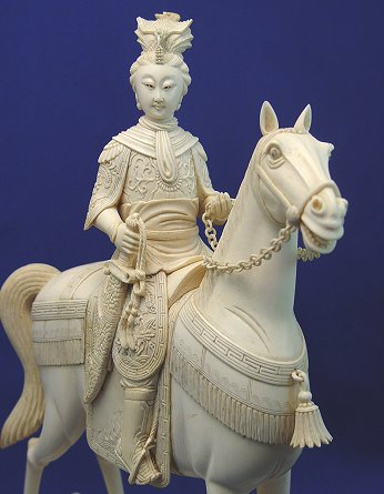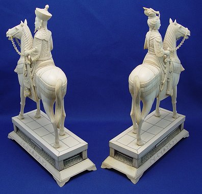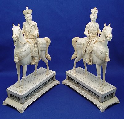 LARGE PAIR OF CARVED IVORY EMPEROR AND EMPRESS ON HORSES: Highly detailed, each mounted on an ivory covered base. 15 1/2''h., x 11'' x 4 1/2''.