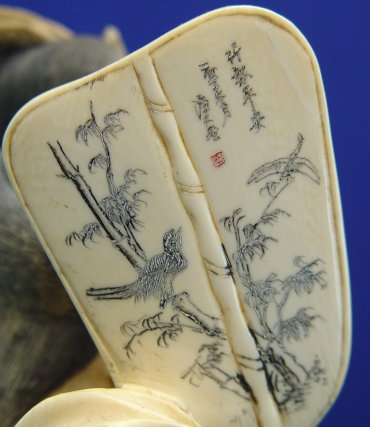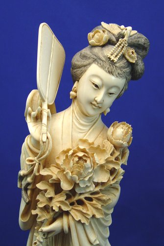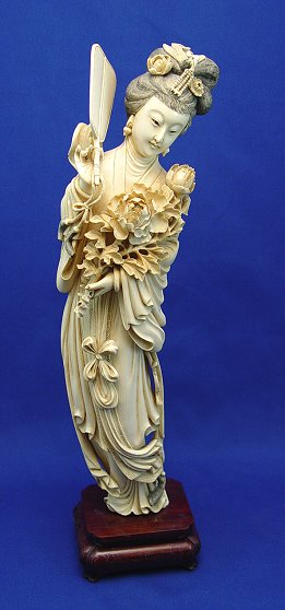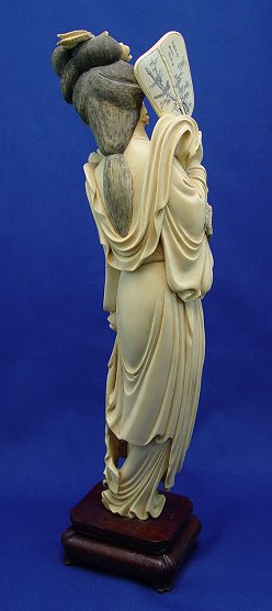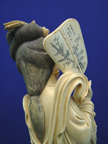 EXQUISITE CARVED IVORY FIGURE: Carved woman showing fine detail of hair and jewelry ornamentation. The fan is inscribed with character writing. 15 1/4'' h, 17 1/2'' h. overall with wooden stand.