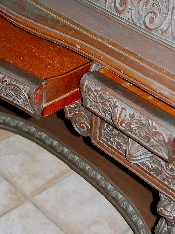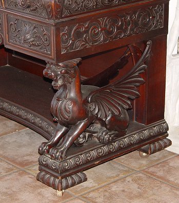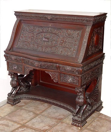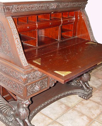 RJ HORNER CARVED MAHOGANY SLANT FRONT DESK: Relief carved panels throughout. Full body griffin supports. Interior of mahogany drawers and cubicles with brass blotter corners on writing surface. 47 1/4''h. x 42 1/2'' x 22'' overall.