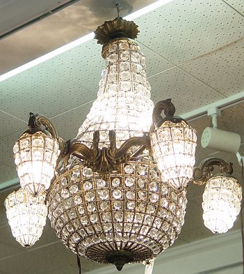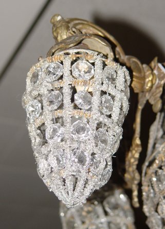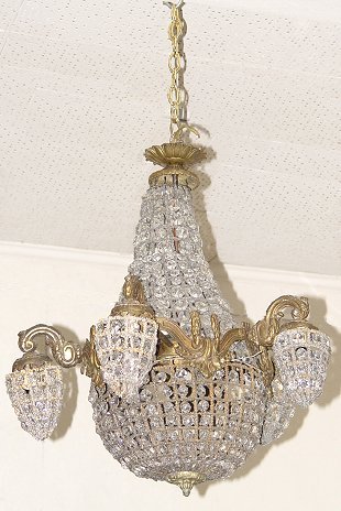 FRENCH CRYSTAL CHANDELIER: 4 side lights around a central dome. Hangs 24'' from the ceiling. In good working order.