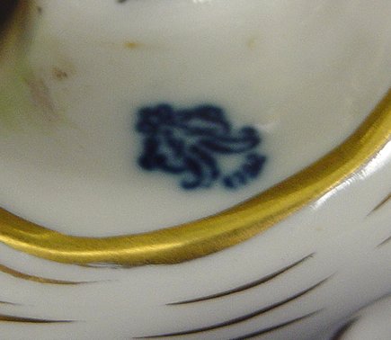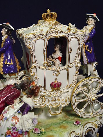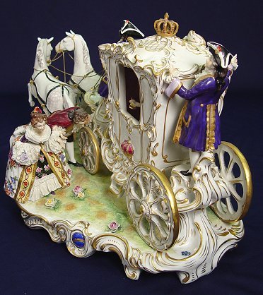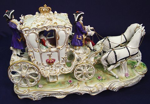VOLKSTEDT GERMAN PORCELAIN HORSE DRAWN CARRIAGE: Ornate figural group includes a pair of dapple gray horses, foot men, and a couple greeting the royal lady. Blue underglaze mark. 13''h. x 22''l. x 13''.
