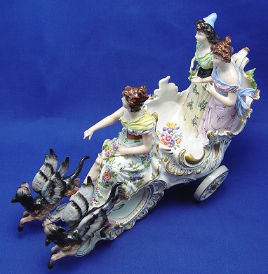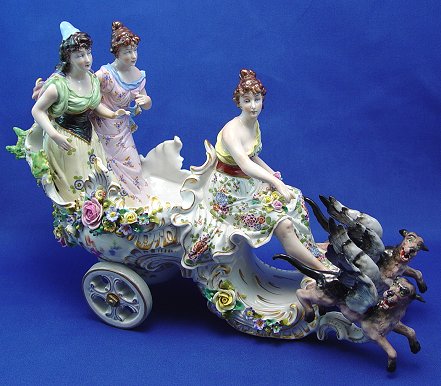 SITZENDORF GERMAN PORCELAIN CHARIOT: Flower encrusted chariot pulled by a pair of winged dogs, driven and ridden by three maidens. Blue underglaze Sitzendorf mark, most current since 1972. 11''h., 17''l.