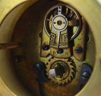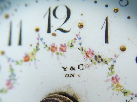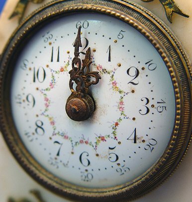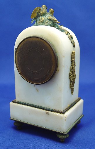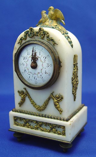 19TH C TIFFANY & CO MINIATURE FRENCH CLOCK: Arched top white marble case surmounted by ormolu birds. Ormolu ribbon and wreath swags and also cherubs adorn the marble. Hand painted enamel dial with flowers and numerals, ornate hands. Key wind brass works are marked ''Made in France''. Dial has remains of Tiffany & Co. London. Worn condition, please call for details. 6''h. x 3'' x 2 1/4'', the dial is 1 3/4'' dia.